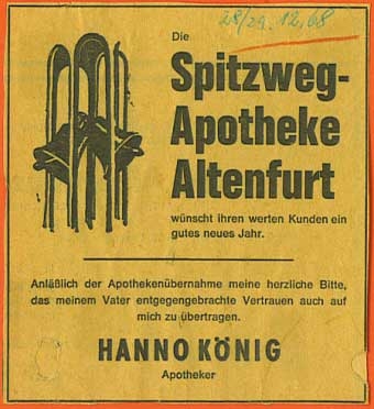 Hanno König baut die Spitzweg Apotheke weiter aus und verlegt den Standort in die heutigen Räume in der Löwenberger Straße 16. Er war der erste Apotheker in Nürnberg, der seinen Kunden aufgrund der Infrastruktur von Moorenbrunn und Altenfurt einen Lieferservice anbot.